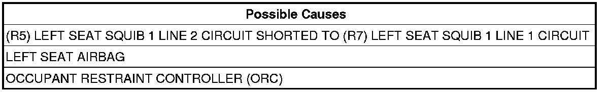The Occupant Restraint Controller (ORC) monitors the resistance of the Left Seat Airbag circuits. If low resistance is detected between the Left Seat Airbag circuits the ORC will set this DTC.