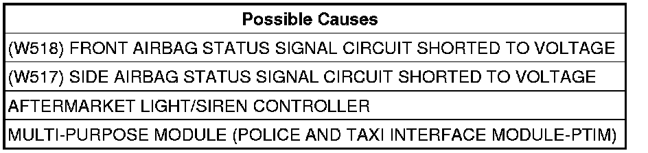Measure the voltage of the (W517) Side Airbag Status Signal circuit between ground and the Multi-Purpose Module (Police And Taxi Interface Module-PTIM) C2 harness connector.