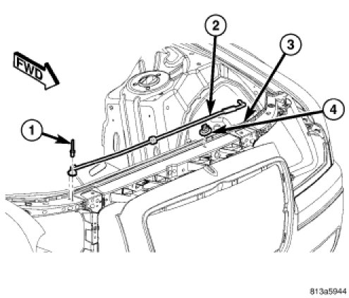 3. Disengage the prop rod from the rod clip (4) on the left side of the headlamp mounting crossmember.