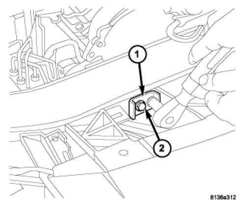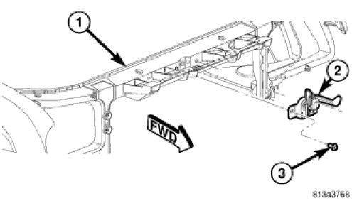 6. Position the latch (2) to the front of the crossmember (1).