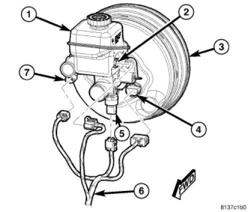 6. If equipped with MK25 and Electronic Stability Program (ESP), connect wiring harness (6) connector at pedal travel sensor (7) on power brake booster (3).