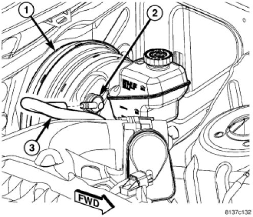 5. Connect vacuum hose (3) to check valve (2) on face of booster (1). Do not remove check valve from booster.