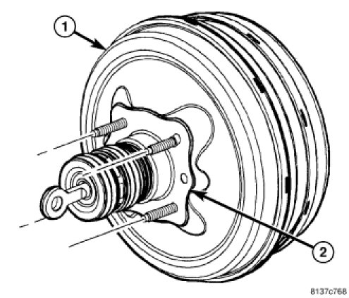 NOTE: Before installing booster, make sure there is a NEW booster seal (2) placed over push rod and mounting studs on rear of booster (1).