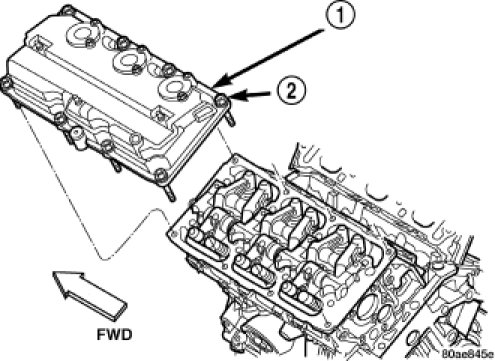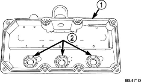 1. Clean cylinder head and cover mating surfaces. Inspect and replace gasket (1) and seals (2) as necessary.