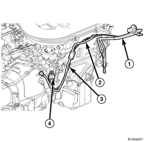 5. Properly position the right engine harness (4) and connect the oxygen sensor, knock sensor, EGR, fuel injector and ignition coil harness connectors.