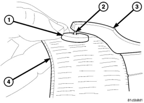 The web stop button replacement kit includes two molded plastic replacement button halves: a male button half with a pointed spike in its center, and a female button half with a hole in its center. The button halves are not available separately. In addition to the button replacement kit, a pair of wheel weight pliers (such as KD Tools(R) #3358, Snap-on(R) #WWPR13A or equivalent) and a gel-type super adhesive glue (such as Mopar(R) Bond-All Gel #04467709 or equivalent) are required.