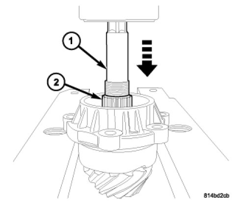 9. Install pinion gear/bearing assembly to housing. Using Installer L-4507 (1), press pinion tail bearing (2) onto shaft until it bottoms.