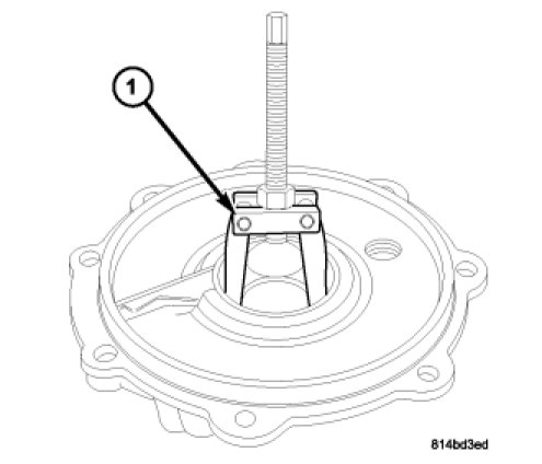 5. Remove differential side bearing cup from axle housing cover. Install Bearing Remover 6514 (1).