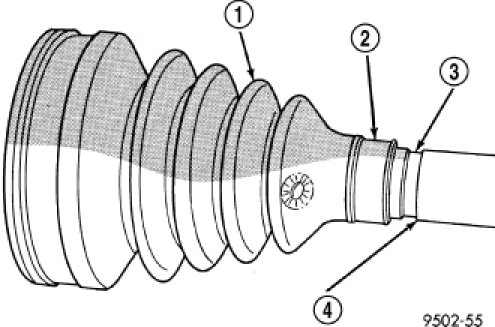 1. Slide inner tripod joint seal boot retaining clamp, onto interconnecting shaft. Then, slide the replacement inner tripod joint sealing boot (1) onto the interconnecting shaft. Inner tripod joint seal boot MUST be positioned on interconnecting shaft, so the raised bead on the inside of the seal boot is in groove (3) on interconnecting shaft (4).