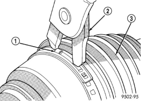 10. Insert a trim stick (4) between the tripod joint (3) and the sealing boot (2) to vent inner tripod joint assembly. When inserting trim stick between tripod housing and sealing boot ensure trim stick is held flat and firmly against the tripod housing. If this is not done damage to the sealing boot can occur. If inner tripod joint has a Hytrel (hard plastic) sealing boot, be sure trim stick is inserted between soft rubber insert and tripod housing not the hard plastic sealing boot and soft rubber insert.