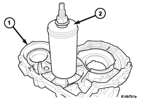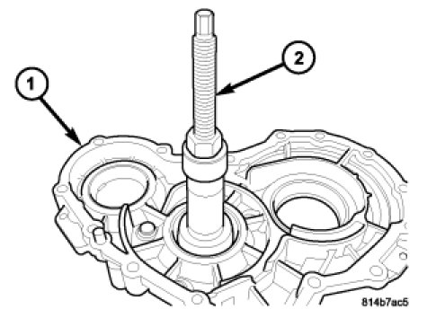 18. Remove the front output shaft (1) from the front housing (2).