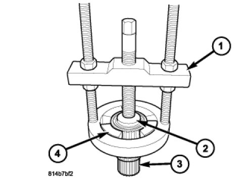 7. Remove the front output shaft flange (2) from the output shaft. If the flange (2) is difficult to remove, use a suitable 2 or 3 jaw puller (1) to remove the flange.