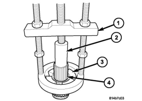 30. Remove the front output shaft (4) rear bearing with Press C-293-PA (1), Plug 8513A (2), and Adapters C-293-52 (3).