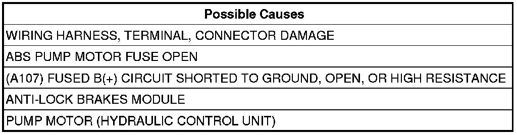 If the Anti-Lock Brakes Module detects either a low voltage condition when the ABS Pump Motor is activated or deactivated or a high voltage condition when the ABS Pump Motor is deactivated.
