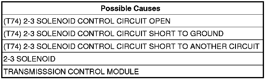 - Repair the (T74) 2-3 Solenoid Control circuit for a short to ground.