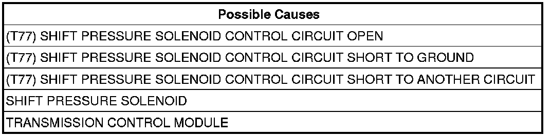 - Repair the (T77) Shift Pressure Solenoid Control circuit for a short to ground.
