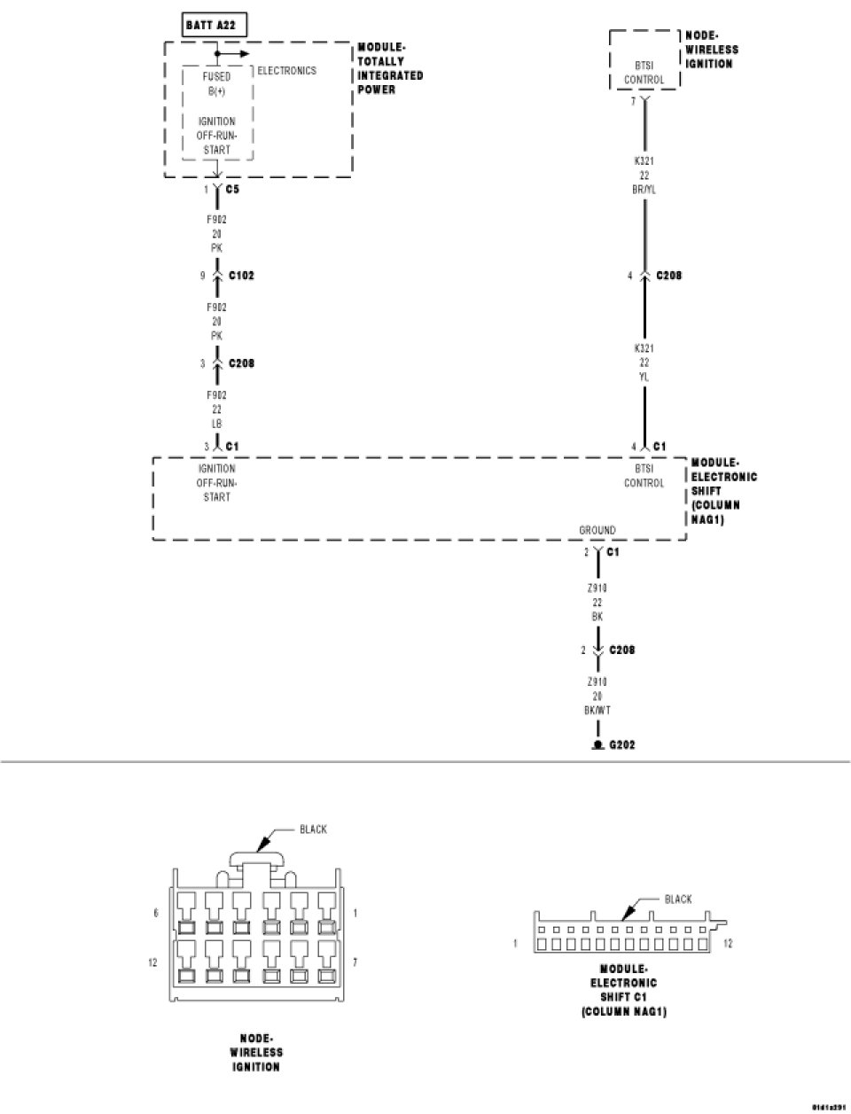 Measure the resistance of the (K321) BTSI Control circuit between the Electronic Shift Module (ESM) harness connector and the WCM harness connector.