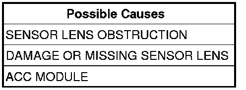 ACC Module detects the lens damaged or missing. The ACC module will disable the Adaptive Cruise Control (ACC) system and the SERVICE ACC message will display in the CCN. Once the DTC goes to stored, the ACC system will return to normal operation. The DTC will be cleared after the ACC Module sees 100 consecutive key cycles of the STORED DTC.