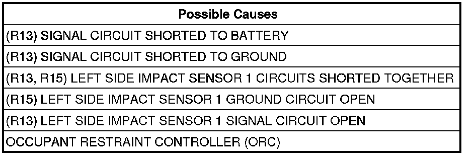 - Repair the (R13) Left Side Impact Sensor 1 Signal circuit for an open or high resistance.