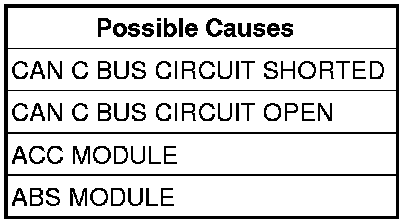 The ACC Module receives an implausible (default/error value or toggle error or parity error are present) message from the ABS Module for 300 millisecond. The ACC module will disable the Adaptive Cruise Control (ACC) system and the ACC UNAVAILABLE message will display in the CCN. Once the DTC goes to stored, the ACC system will return to normal operation. The DTC will be cleared after the ACC Module sees 100 consecutive key cycles of the STORED DTC.