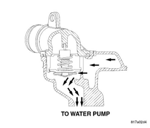 Up to a coolant temperature of approximately 87° C (189° F), the main valve is closed and the bypass valve fully open. The flow through the radiator is interrupted and coolant flows through the bypass passage directly to the inlet side of the water pump.