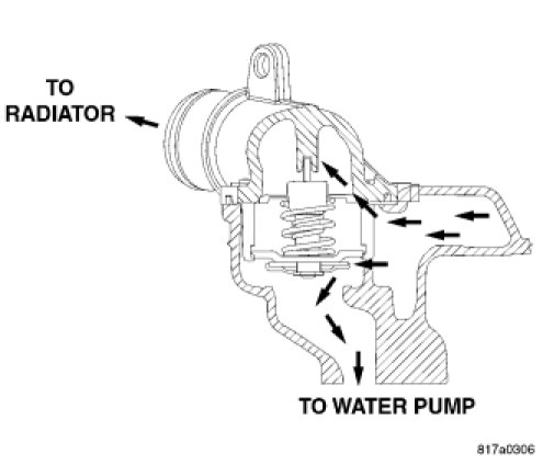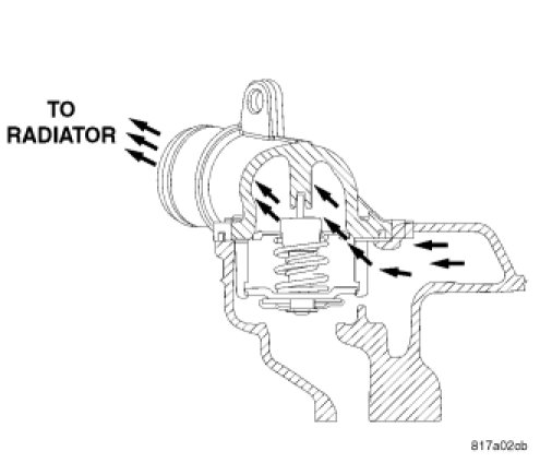 The engine cooling thermostat is a wax pellet driven, reverse poppet choke type. The thermostat is designed to provide the fastest warm up possible by preventing leakage through it and to guarantee a minimum engine operating temperature of 88 to 93° C (192 to 199° F). The thermostat also will automatically reach wide open so it will not restrict flow to the radiator as temperature of the coolant rises in hot weather to around 104° C (220° F). Above this temperature the coolant temperature is controlled by the radiator, fan, and ambient temperature, not the thermostat.