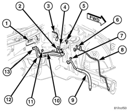 16. Position the rear section of the A/C suction line (12) and the rear section of the A/C liquid line (10) as an assembly into the engine compartment.