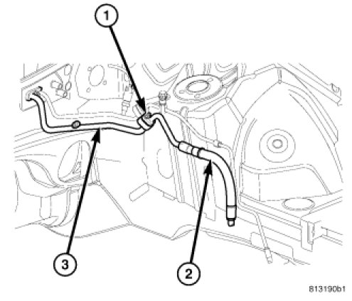 1. Position the front section of the A/C suction line (2) into the engine compartment.
