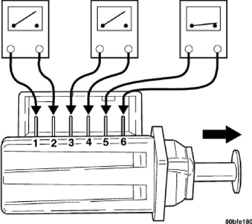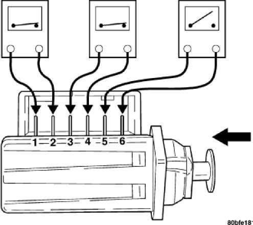 4. With the switch in the depressed position (plunger pushed in), use an ohmmeter to test each of the three internal switches as shown. You should achieve the results as indicated in the figure.