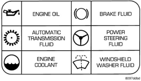 Chrysler uses international symbols to identify engine compartment lubricant and fluid inspection and fill locations.