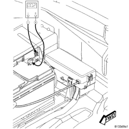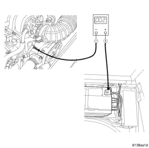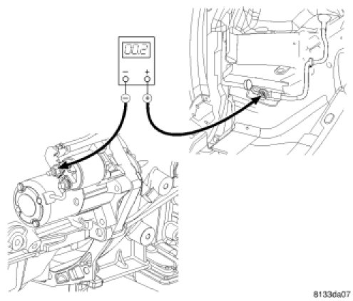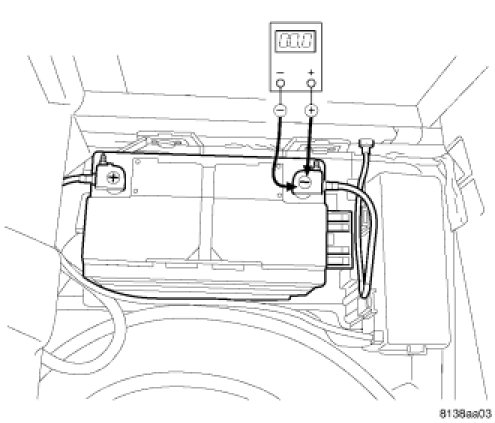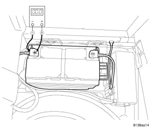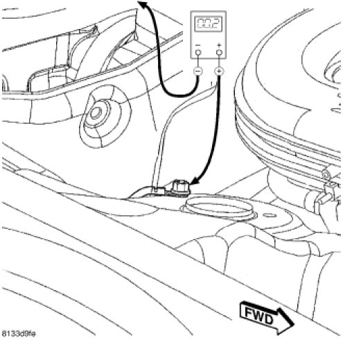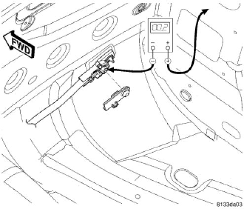 1. Remove the spare tire cover to gain access to the battery. Connect the positive lead of the voltmeter to the battery negative terminal post. Connect the negative lead of the voltmeter to the battery negative cable terminal clamp. Rotate and hold the ignition switch in the Start position. Observe the voltmeter. If voltage is detected, correct the poor connection between the battery negative cable terminal clamp and the battery negative terminal post.