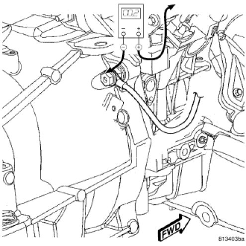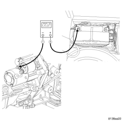 5. Connect the voltmeter to measure between the battery negative cable eyelet terminal connection at the right front strut tower and the battery negative cable eyelet terminal connection at the transmission housing. Rotate and hold the ignition switch in the Start position. Observe the voltmeter. If the reading is above 0.2 volt, clean and tighten the battery negative cable eyelet terminal connection at the right front strut tower. Repeat the test. If the reading is still above 0.2 volt, replace the battery front negative cable, Battery Cables - Removal.