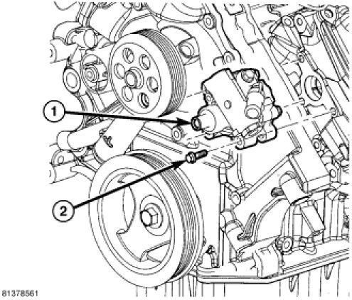 2. Install three pump mounting bolts (2) through access holes in pulley. Tighten bolts to 28 Nm (21 ft. lbs.) torque.
