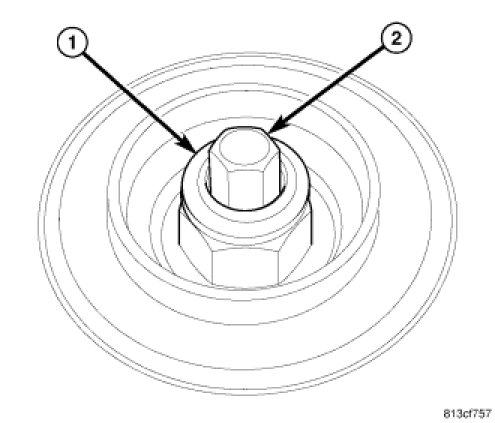 9. Install retaining nut (1) on shock shaft (2) as far as possible by hand. Make sure nut is installed far enough for 8 mm socket to grasp hex (2) on end of shaft for tightening.