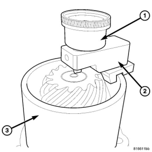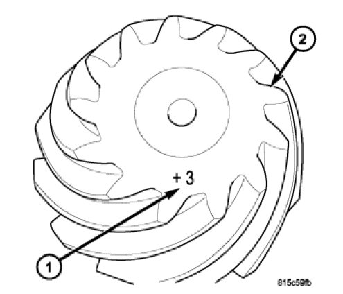 Identifying numbers for the ring gear and pinion are marked on the pinion (1). A plus (+) number, minus (-) number or zero (0). The pinion depth variance/deviation (1) is the amount the depth varies from the standard depth setting of a pinion marked with a (0). The standard depth provides the best gear tooth contact pattern.