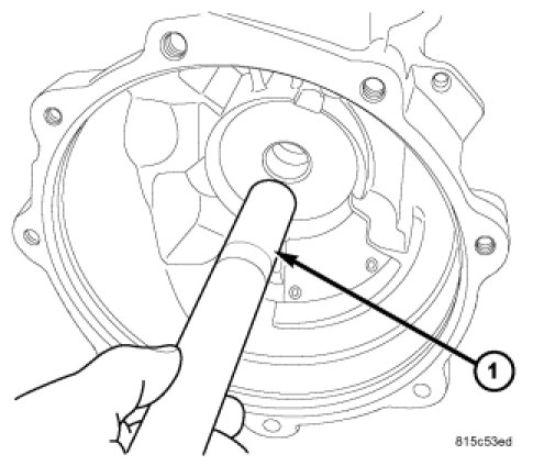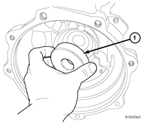 The pinion depth is set by selecting the shim (1) that fits between the pinion housing and the axle housing.