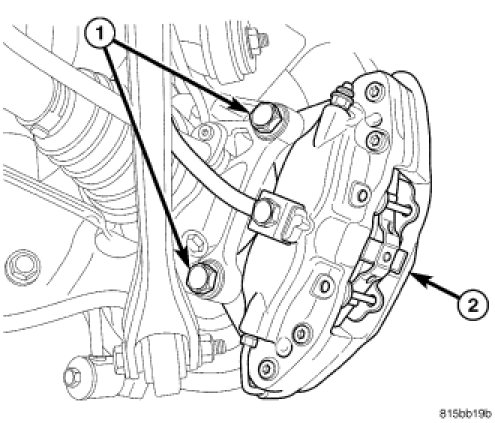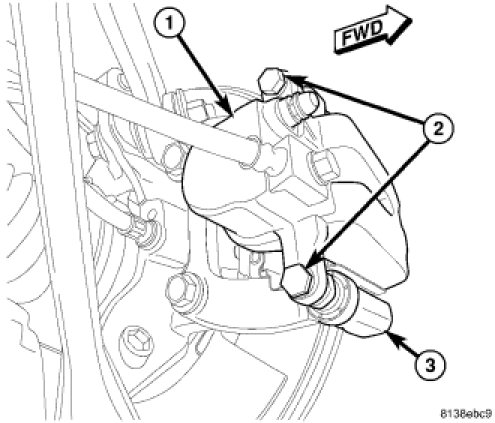 CAUTION: Extreme caution should be taken not to cross-thread caliper guide pin bolts (2) when they are installed.