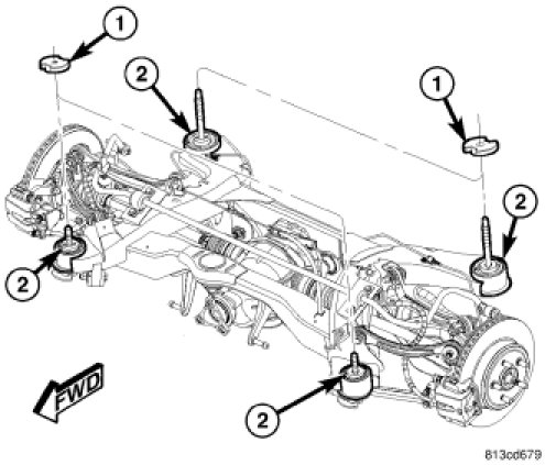 NOTE: There are four crossmember mounting bolts. Rear mounting bolts (2) are longer than front mounting bolts (3). Do not interchange mounting bolts.