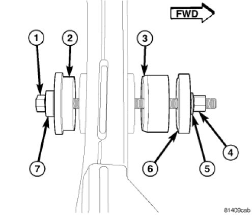 NOTE: It is important that tapered end (3) of bushing be installed first into forward end of crossmember to ease installation.