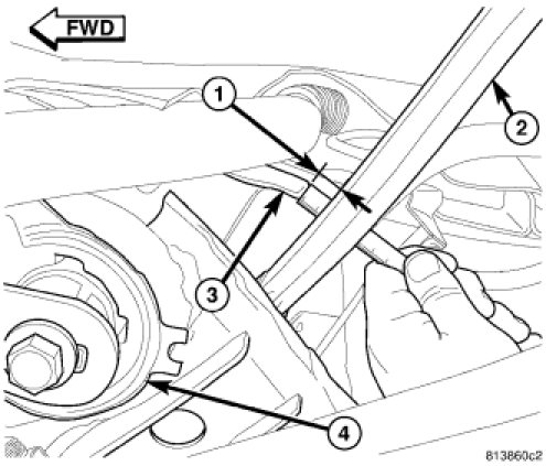 23. Once mounts are lined up with location marks, on both sides of vehicle, measure distance (1) between the tension link (2) and weld flange (3) on body directly in front of it, just outboard of the front mount bushing (4). This distance must be at least 12 mm to allow proper clearance for suspension movement. If distance is less than 12 mm on either side of vehicle, shift that side of rear crossmember directly rearward until distance is 12 mm or greater. To do so, loosen 3 mounting bolts slightly, leaving one on opposite side of shift snugged to pivot off of. Shift crossmember rearward and snug loosened bolts. Remeasure opposite side to be sure it still maintains minimum 12 mm distance.