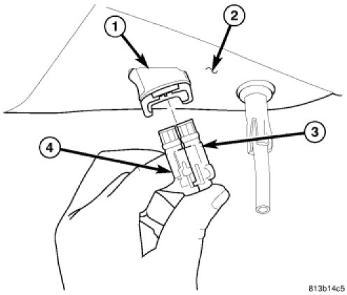 29. Insert speed sensor connectors (3 and 4) into body wiring harness connector (1) located in luggage compartment floor pan (2). When installing connector, make sure retaining clip on body connector is properly in place and sensor connector cannot be pulled out.