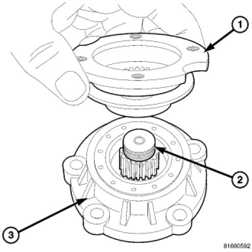 1. Rotate differential side gears about case and remove side gears (2) and thrust washers (1).