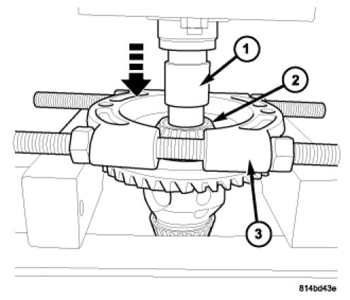 5. Using Plug 9676 (1) and Bearing Splitter 1130 (3), press differential side bearing (2) off of ring gear side and discard.