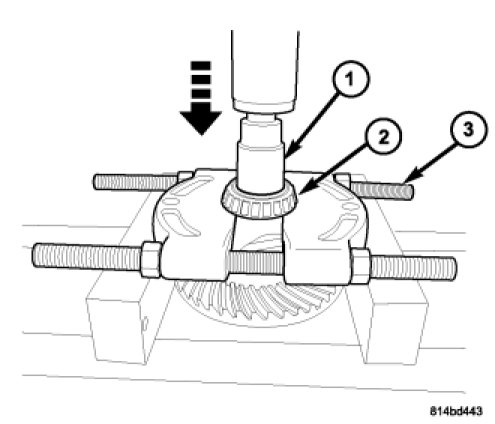 6. Using Plug 9676 (1) and Bearing Splitter 1130 (3), press differential side bearing (2) off of opposite side and discard.