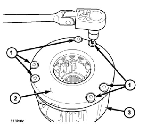 6. Install the bolts (1) holding the planetary cover (2) to the planetary assembly (3). Tighten the bolts to 9 Nm (6.5 ft.lbs.).