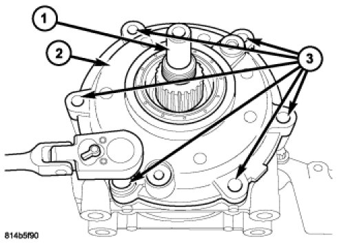 33. Install the bolts (3) to hold the transfer case rear cover (2) to the transfer case. Tighten the bolts in a cross pattern to 34 Nm (25 ft.lbs).