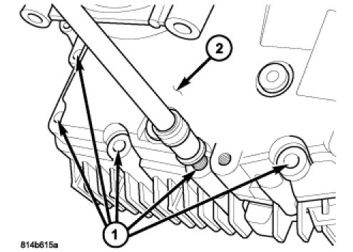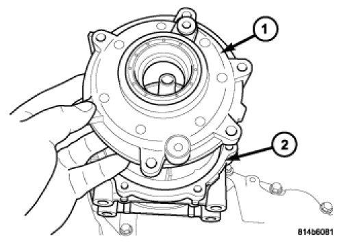 23. Install the bolts (1) to hold the rear housing (2) to the front housing. Tighten the bolts in a cross pattern to 34 Nm (25 ft.lbs.) for the 30 and 45 mm long bolts.