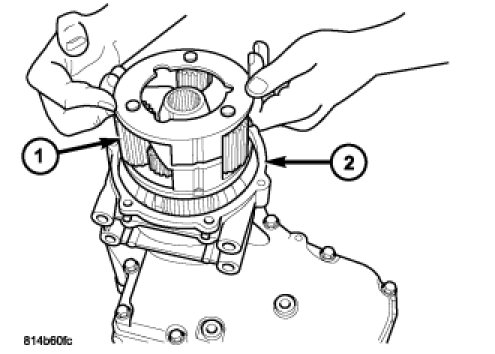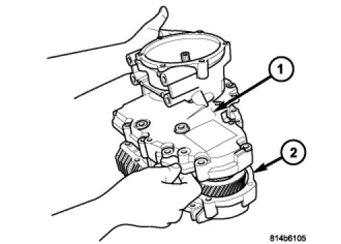 25. Install the planetary gear system (1) into the transfer case rear housing (2).