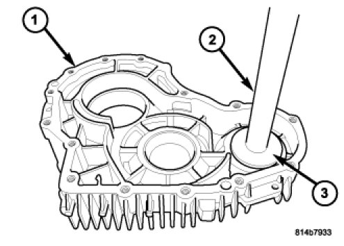 6. Install the front output shaft rear bearing race into the rear housing (1) with Handle C-4171 (2) and Installer D-130 (3).