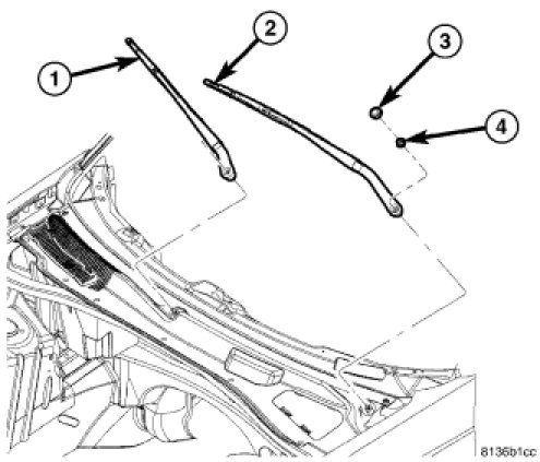 6. Install the wiper arms (1) and (2) Wiper Arms - Installation. Torque nuts to 18 Nm (150 in. lbs.).